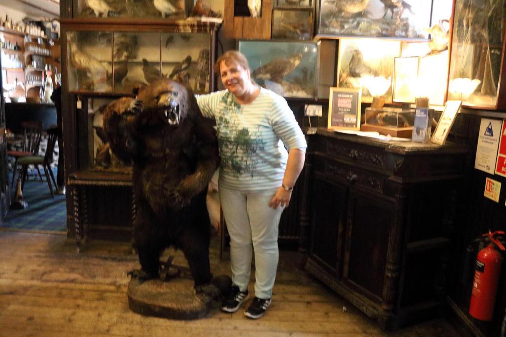 Am Montag morgen wollten wir früh starten, bereits um 7, um auf jeden Fall pünktlich zu unserer Zugfahrt in Fort William zu kommen. Zuallererst aber mussten wir das Apartment räumen, d.h. Koffer packen und ins Auto bringen, die Wohnung sauber hinterlassen, die Mülleimer leeren und den Schlüssel in den Briefkasten werfen, wie mit der Agentur abgesprochen. Frühstück wollten wir erst im Drover’s Inn einnehmen, unserer ersten Station des Tages, wo ich einen Tisch fürs Frühstück reserviert hatte, ein ganz außergewöhnliches Gasthaus. Also ging es, nachdem die Koffer verstaut waren, wir die Schlüssel eingeworfen und Karin ihren ersten Kaffee des Tages aus der Tinderbox erhalten hatte, gegen Viertel nach 7 auf die Strecke. Kurz auf die M8 und danach auf die Great Western Road, die als A82 immer weiter nach Nordwesten führt und die uns im Laufe des Tages bis nach Fort William bringen sollte. Allerdings kamen wir doch so langsam in den morgendlichen Berufsverkehr und das Navi packte auf die angezeigte voraussichtliche Ankunftszeit ständig etwas drauf. Die Gegend wurde ländlicher, wir kamen in das Naturschutzgebiet Loch Lomond and the Trossachs und fuhren dann wirklich viele, sehr viele Meilen am Loch Lomond entlang. Endlich, nach gefühlten Millionen von Kurven, erreichten wir den Drover’s Inn, es war schon nach 9 Uhr und Frühstück gab’s nur bis halb 10. Es ist ein schönes rustikales Restaurant in einer alten Poststation aus dem 17. Jahrhundert, sehr urig eingerichtet und mit über 100 ausgestopften Tieren, die überall verteilt stehen, Höhepunkt ist der mannsgroße Bär im Flur und der Metallhai in einer Stube; der echte ausgestopfte Hai, der früher im Flur hing und den ich letztes Jahr noch gesehen hatte, ist leider abgestürzt, soll aber wieder aufgehängt werden. Die Frühstücksauswahl war leider ziemlich überschaubar, bestand vor allem aus Rühreiern, Toast und Marmelade sowie ziemlich leckerem Tee. Ich hatte meinen Mädels schon einiges an Stories berichtet, die ich letztes Jahr vom damaligen Wirt erzählt bekommen hatte. Während der Wartezeit ließen wir uns vom jungen Kellner ein paar weitere Gruselgeschichten erzählen. Der verstorbene, Old George genannte Stammgast, der seine Urne in der Kneipe verwahrt haben wollte, ruht tatsächlich hinter dem Ölgemälde rechts an der Wand im Pub, allerdings nicht nur er, er hat dort noch ein paar andere zur Gesellschaft, post mortem sozusagen... Und wer noch zufällig ausgestopfte Tiere zu Hause hat, die er nicht mehr braucht oder möchte, kann sie hierher schicken und sie geben ihnen ein neues Zuhause!